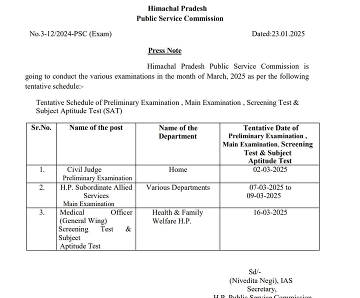 The Himachal Pradesh Public Service Commission has announced the tentative schedule for various examinations in March 2025. The schedule includes the Preliminary Examination for Civil Judge on March 2nd, the Main Examination for H.P. Subordinate Allied Services from March 7th to 9th, and the Screening Test & Subject Aptitude Test for Medical Officer (General Wing) on March 16th.